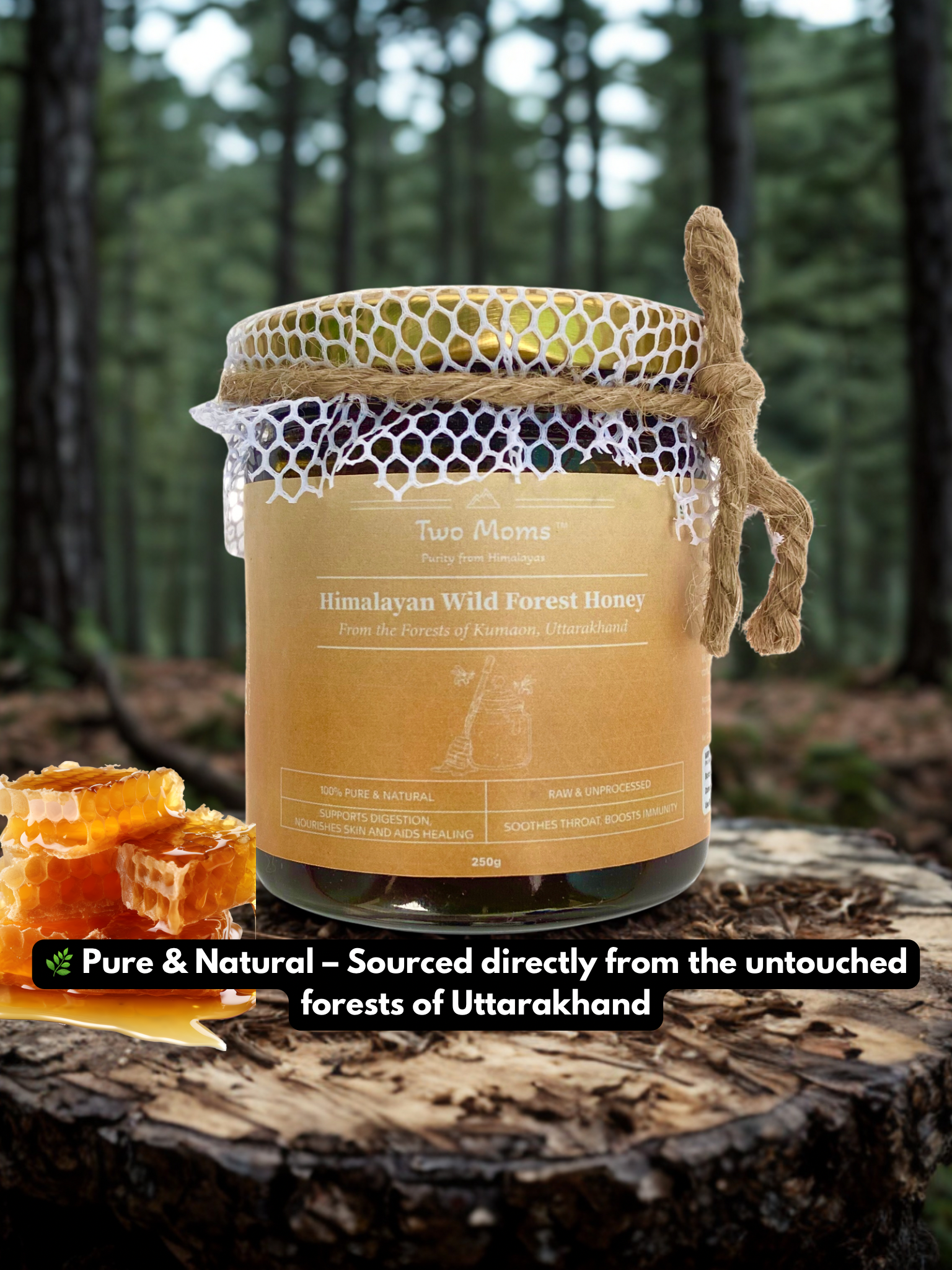 Pure Himalayan Wild Forest Honey — naturally collected from pristine forests of Kumaon region in Uttarakhand, unprocessed and chemical-free. Rich in antioxidants, enzymes, and natural goodness, it boosts immunity, soothes digestion, and nourishes overall wellness with the purity of nature.